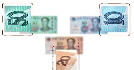 新版人民币安全线改变观察角度,颜色在红色和绿色之间变化。透光观察可见货币符号与面额数字。50元还有亮光带上下滚动。