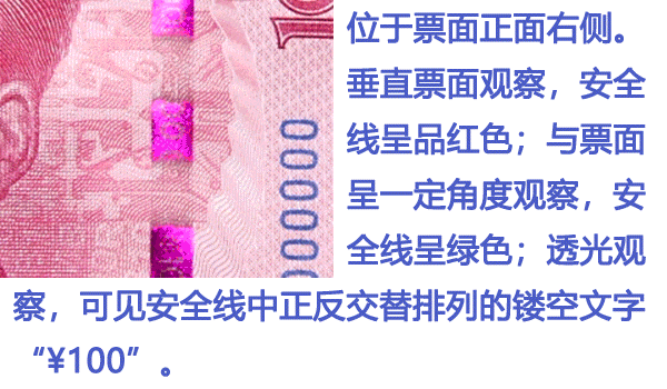 光彩光变技术是国际印钞领域普遍使用的先进防伪技术,在具备图案绚彩动感的同时,又易于公众识别。