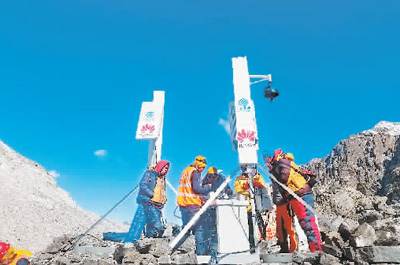 工程师们在珠穆朗玛峰上安装、调试基站。 (华为技术有限公司供图)